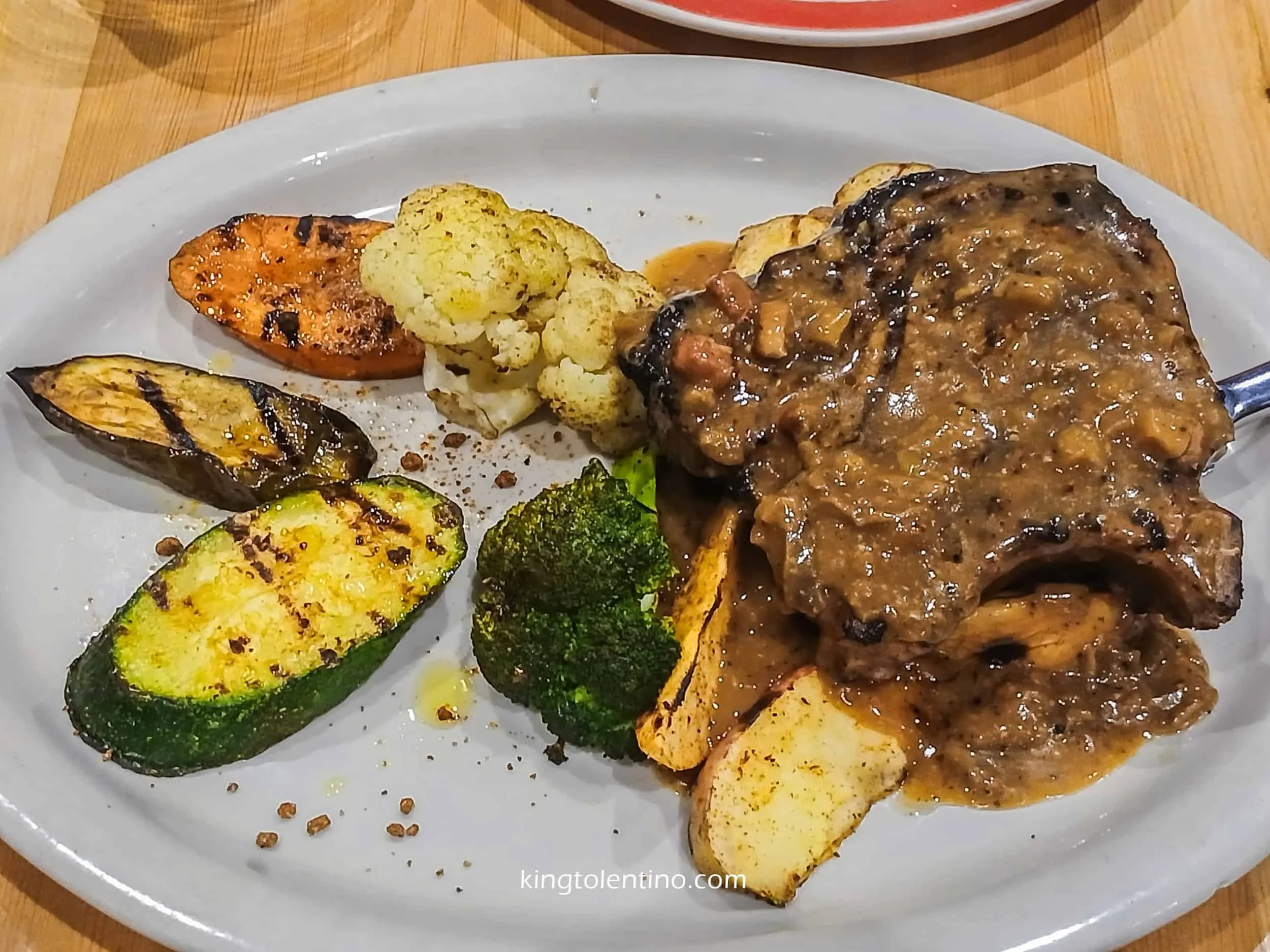 The Double Cut Porkchop comes in a large plate, featuring two thick slices of pork chops topped and veggies.