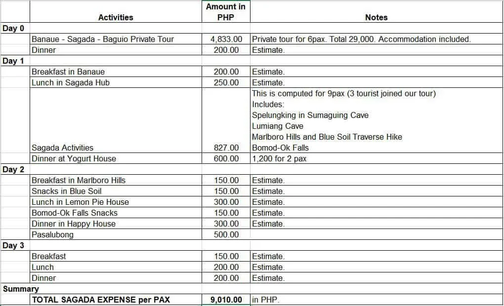 The estimated budget for a 3 days 2 nights stay in Sagada is around Php9,000.00 per person. This is computed based on 6 pax and a private tour package.