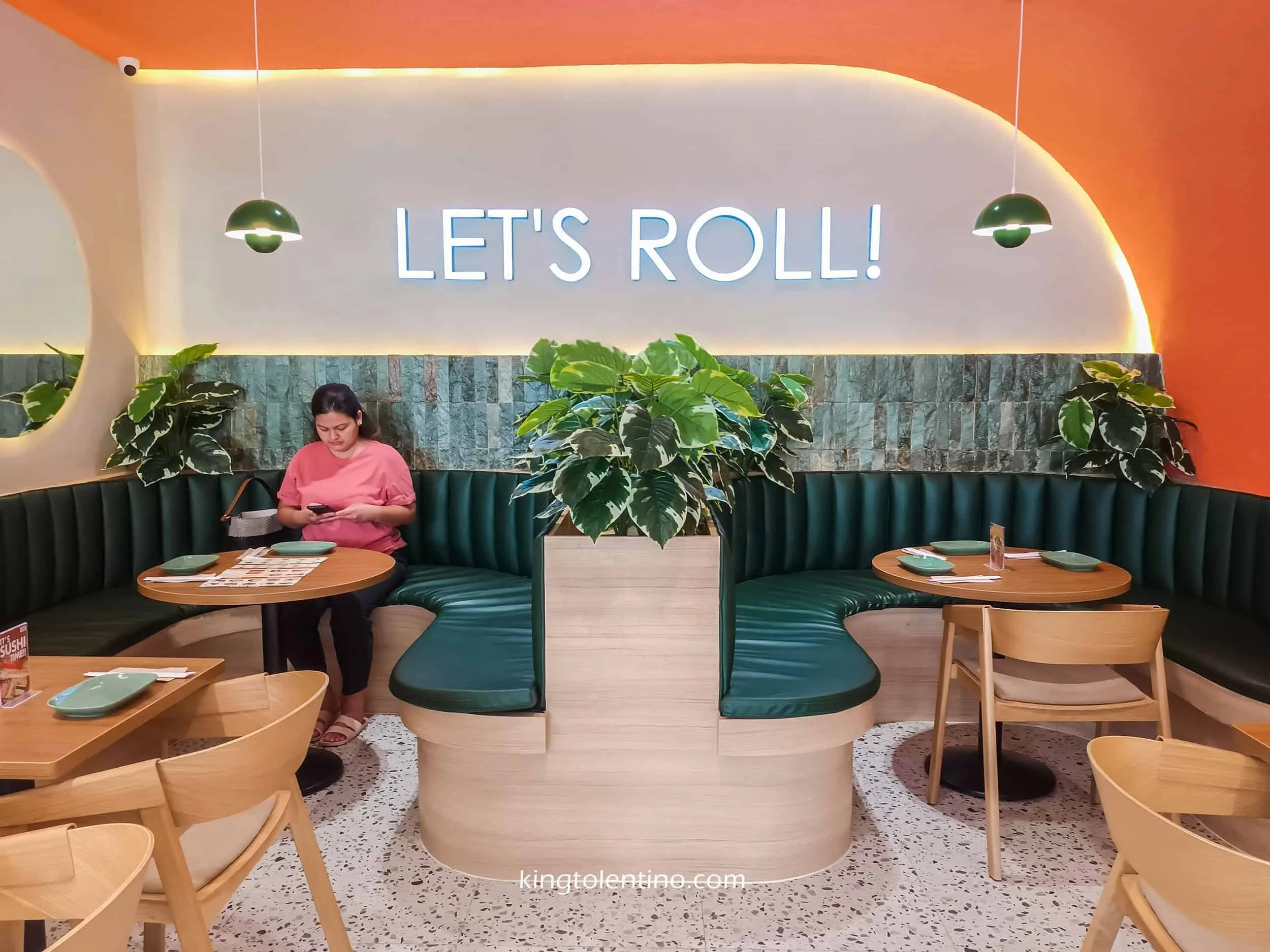 The interior of Sushi Nori in Nuvali has a vibrant and modern atmosphere featuring a bright orange theme. The design is accented by plants and a “Let’s Roll” neon lights.